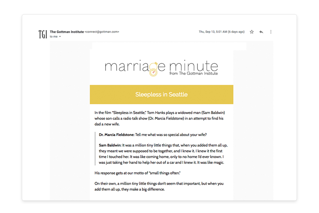 The Marriage Minute is a free email newsletter from The Gottman Institute that will improve your marriage in 60 seconds or less. Over 40 years of research with thousands of couples has proven a simple fact: small things often can create big changes over time.